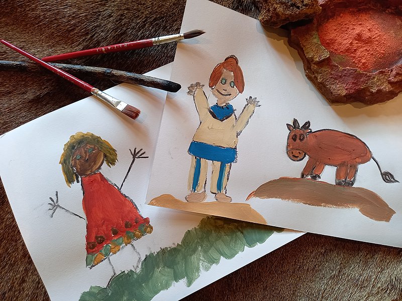 Nach einer Pause wird es bunt – wir zeichnen mit angekokelten Ästen und stellen selbst Erdfarben her! Die Kinder dürfen kreativ werden und ihre Eindrücke aus der Ausstellung umsetzen. Jedes Kind darf sein Bild mit nach Hause nehmen.