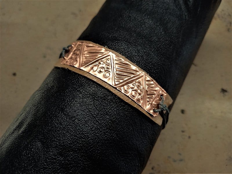 Nach einer Pause wird ein Armband aus Leder und Kupferblech gestaltet. Ein Rohling aus Kupfer wird geschliffen, geprägt und patiniert. Das verzierte Blech wird auf einem Lederstreifen angebracht und das Ganze mit einem Knoten verschlossen. Das Armband dürfen die Kinder mit nach Hause nehmen.